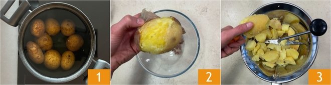 To make the duchess potatoes, boil the potatoes with their skins starting from cold water for about 30-40 minutes, until they are tender enough to be easily pierced with a fork 1. Peel the potatoes while still hot 2 and pass them through a potato ricer 3.