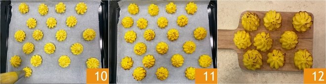Squeeze out tufts onto a baking sheet lined with parchment paper 10 and bake in a preheated convection oven at 350°F for 15-20 minutes, until golden 11. Serve your duchess potatoes immediately 12!