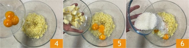 Gather the mashed potatoes while still hot in a bowl and add the yolks 4, butter 5, and grated cheese 6.