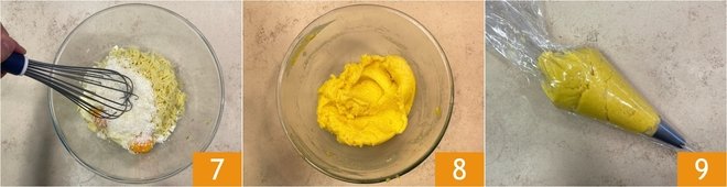 Salt, pepper, and mix everything with a hand whisk 7 until you get a homogeneous mixture 8. Transfer the mixture to a piping bag with a half-inch star tip 9.