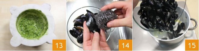 Mix the ingredients well until you get a homogeneous sauce 13. Set the pesto aside and take care of the mussels. How to Clean and Open Mussels: rinse them under fresh running water. With the back of a knife blade, remove all the incrustations, and manually remove the beard. Still under fresh running water and using a steel wool pad 14, scrub the mussels vigorously to remove all impurities. Cook the mussels by placing them in a pot with a drizzle of olive oil and a clove of garlic 15, cover them with a lid, and let them open spontaneously over high heat, it will take about 5 minutes.