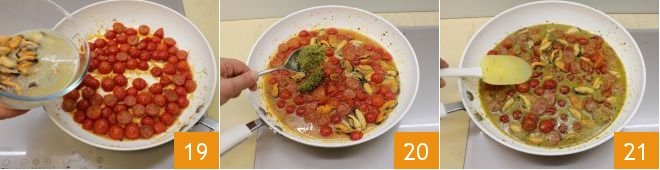 then add the mussels with their water 19, continue for another 5 minutes, and then incorporate the pesto 20, stir to flavor 21 and turn off the heat.