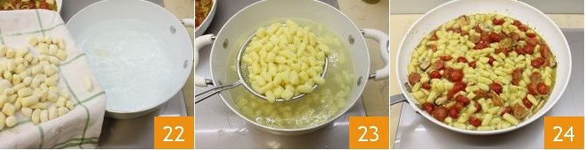 Put a pot with plenty of salted water on the stove and bring it to a boil, cook the dumplings for a few minutes 22, drain them as soon as they surface 23, and pour them into the pan with the sauce. Let the preparation flavor for a few seconds over medium heat and then serve the dumplings with cherry tomatoes, pesto, and mussels well hot 24!