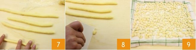 Then, divide the dough into many logs with a thickness of 3/8 inch 7, cut them into pieces of 5/8 inch with a knife or dough scraper 8, and gradually place them on a floured tray 9.