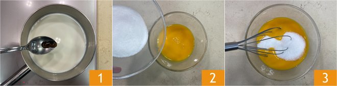 To prepare the Easter Bavarian Cream with Pistachio and Raspberries, first focus on the custard: soak the gelatin in cold water. Pour the milk and vanilla extract into a saucepan 1, then heat on the stove. Meanwhile, put the egg yolks with the sugar in a bowl 2 and mix with a whisk 3.