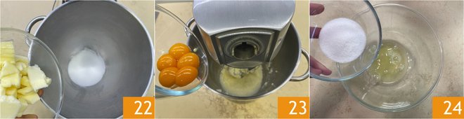 Proceed with the biscuit preparation: pour the sugar and softened butter into the bowl of a stand mixer 22, then beat until soft. Add the egg yolks, one at a time 23, until they are fully incorporated. Alternatively, you can beat them quickly and add them in a slow stream to the mixer. In a bowl, combine the egg whites and sugar 24.