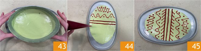 Carefully unmold the Bavarian cream on top of the biscuit 43; if necessary, you can slightly warm the mold with a torch. Finally, decorate with raspberry sauce as desired 44. Let rest in the refrigerator for an hour before serving your beautiful Easter Bavarian Cream with Pistachio and Raspberries 45!