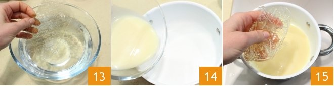 Soak the gelatin in very cold water for 10 minutes 13 or until it has softened. Pour the condensed milk into a small saucepan 14, heat it, and when it is very hot, turn off the heat and add the softened, drained, and squeezed gelatin 15; stir to dissolve it.