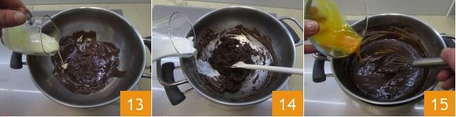 As soon as the chocolate is melted, pour in the room temperature condensed milk 13 and stir continuously. Don't worry if it thickens, by adding the hot milk 14 and continuing to stir with a whisk, the mixture will blend well; then add the egg yolks and continue cooking for 2-3 minutes 15 while still stirring.