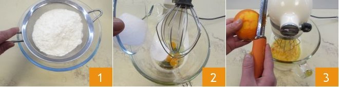 First of all, begin by preparing the olive oil cake, so in a bowl sift the flour and the baking powder 1. In the bowl of a stand mixer already equipped with a whisk, pour in the room temperature eggs and add the sugar and a pinch of salt 2 (if you don't have a stand mixer use an electric hand mixer). Turn on the stand mixer and let it work the mixture well, add the orange zest 3.