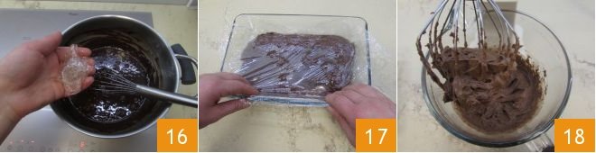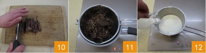On a cutting board and with the help of a sharp knife, chop the chocolate 10 and then let it melt in a double boiler 11, while in another small pot heat the milk 12.