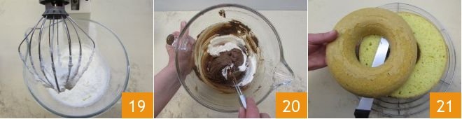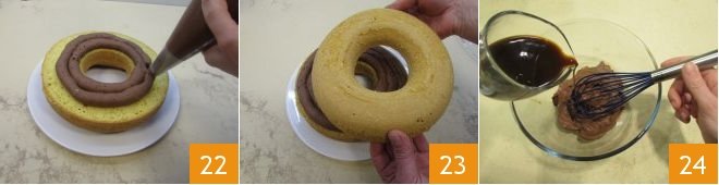 Fill the ring cake with the cream 22 creating concentric circles, then reassemble the ring cake with the other half 23. With the leftover cream, prepare the glaze by mixing it with the coffee 24.