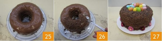 Finally, place the ring cake on the wire rack and put a plate underneath to catch the glaze that will drip when poured 25, decorate the cake by sprinkling it with chocolate shavings 27, and put it in the fridge for 30 minutes. Complete the Easter nest ring cake by decorating it with chocolate eggs covered in colored sugar.