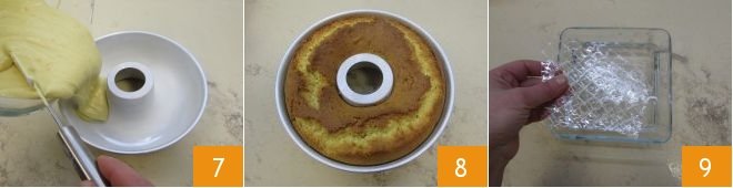 Grease and flour a 9-inch ring cake mold and pour in the mixture spreading it with a spatula 7; it's important to level the batter carefully. Bake in a preheated oven at 340°F for 50 minutes. When the ring cake is cooked, let it cool slightly before removing it from the pan 8 and then let it cool completely on a wire rack. Meanwhile, prepare the cream by soaking the gelatin sheets in a little cold water 9.