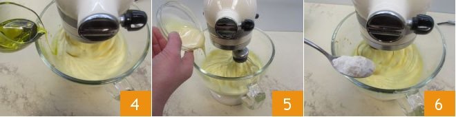 Then slowly pour in the olive oil 4 and once it is well incorporated, add the room temperature condensed milk 5. Finally, add the sifted dry ingredients 6 little by little so as to obtain a fluid and homogeneous mixture.