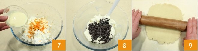 Then quickly work the mixture by hand 4 until you obtain a compact and homogeneous dough; wrap it in plastic wrap 5 and let it rest for about 30 minutes in the refrigerator or until it is firm; in the meantime, prepare the tart filling: sift the cow's ricotta through a fine-mesh sieve so that it is smooth 6 and collect it in a large bowl,