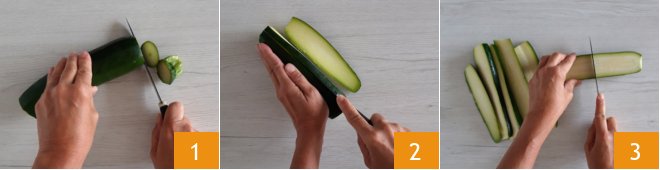 To make the baked zucchini, first wash and trim the zucchini 1. Slice the zucchini lengthwise, making long slices 2 about 1/4 inch thick. Then, cut each slice in half 3.