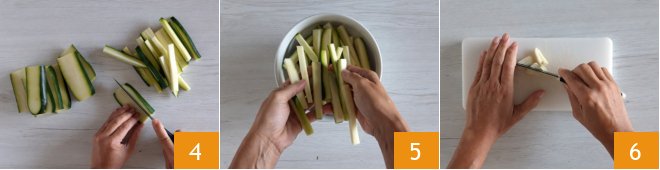 Cut the zucchini into sticks about 1/4 inch thick 4. Place the zucchini sticks in a bowl 5. Mince the garlic with a knife 6.