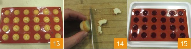 Transfer to the fridge and let set for at least 3 hours. Unmold the now cold pastries 13 and cut off the tops with a serrated knife 14, unmold your gelées 15.