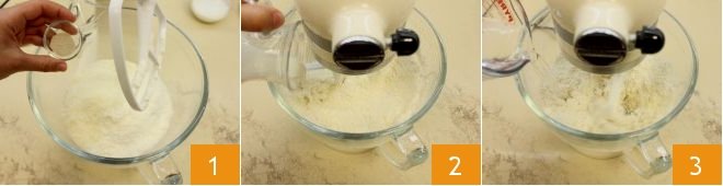 To prepare the savory ball-shaped pie, start with the brioche bread base: in the bowl of a stand mixer, pour the sifted flours, grated Grana cheese, sugar, and instant yeast 1; also add the milk at room temperature gradually 2 and start activating the paddle attachment. When the milk has been absorbed, add the water at room temperature 3.