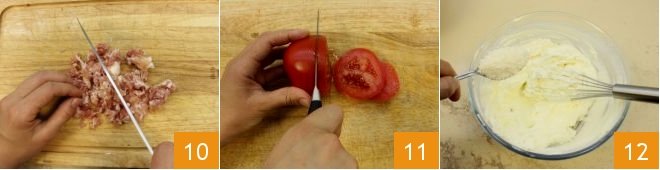 the prosciutto 10 (you can set aside 2 whole slices of prosciutto), slice the tomato 11, and wash the lettuce leaves. In a bowl, pour the fresh spreadable cheese and soften it by mixing with a whisk, season with a drizzle of oil, add the fresh cream to thin and the grated Grana cheese 12.