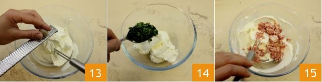 Sprinkle the cream with nutmeg 13 and mix everything. Then divide the mixture into two equal parts in two small bowls and add the chopped basil to one 14, and the prosciutto to the other 15. Mix and transfer the two creams into two separate piping bags to store in the refrigerator until ready to use.