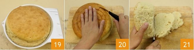 Once cooked, take it out of the oven 19 and let it cool slightly, then gently unmold it and let it cool completely on a wire rack. When it is cold, cut around the entire perimeter of the pie with a small knife, leaving about 0.6-0.8 inches from the edge 20. Scoop out the inside reaching the bottom to form a cavity (being careful not to pierce it). You can make 2 slices with the inner part 21, which will be the layers alternated with the creams (with the leftover brioche bread, you can make cubes to toast in the oven).