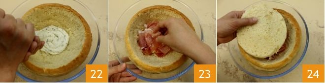 Then take the piping bags with the creams and start filling the ball-shaped pie with all the basil cream at the bottom 22, then add the whole slices of prosciutto 23, cover with a layer of brioche bread 24 and continue with all the prosciutto cream.