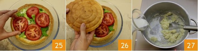 Place the lettuce and tomato slices 25. Then close with the base of the ball-shaped pie 26. Now place the pie in the refrigerator for at least 30 minutes, covered with plastic wrap, and in the meantime, dedicate yourself to the covering: in a saucepan, melt the butter over low heat, then sprinkle in the sifted flour and mix with a whisk to obtain the roux. When it is golden, add the milk gradually 27, mix, and let it heat up.