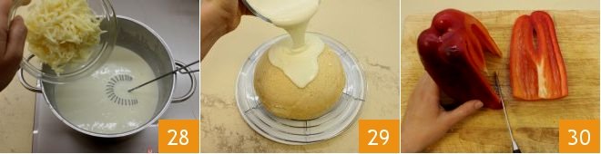 When the mixture thickens and boils, adjust the salt and add the grated Fontina cheese 28. Turn off the heat and stir to melt it completely; you can adjust the salt if necessary. Let the béchamel cool slightly and then pour it over the ball-shaped pie placed on a wire rack 29. Place the pie back in the refrigerator to firm up for at least 1 hour. While it solidifies, prepare the garnish: remove the tops from the red and green peppers, eliminate the seeds and internal filaments, and cut into strips 30;