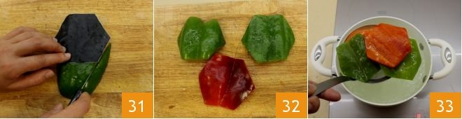 you will need to obtain 11 hexagons about 2 inches on each side (31-32). Blanch them for a few moments in boiling water, then drain them 33 and let them cool completely on absorbent paper.