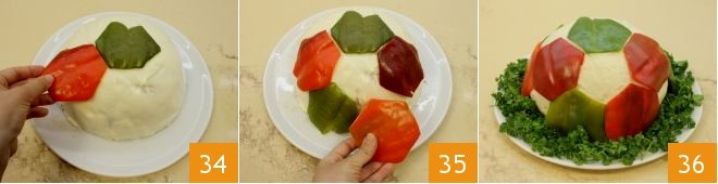 Then place the ball-shaped pie on a serving dish, and start placing the hexagons alternately on the pie, starting from the central hexagon, to create the typical ball surface; also leave some empty spaces (34-35), to get a tricolor pattern. Serve the savory ball-shaped pie with curly parsley or salad around it to simulate the green soccer field 36!