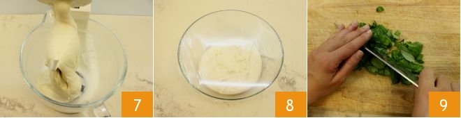 When the dough is smooth and cascades like a ribbon 7, stop the mixer and place it in a lightly oiled bowl, cover with plastic wrap 8. Let it rise for at least 30 minutes in a warm place (under a woolen blanket or in a turned-off oven with the light on). In the meantime, dedicate yourself to the filling: finely chop the basil 9,
