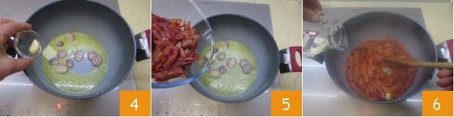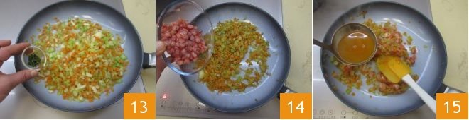 Then add the thyme 13 and let all the ingredients brown for about 6-7 minutes. When they are well-browned, add the chopped shrimp (set aside about 80 grams) 14 and cook for a few minutes; add about 50-60 grams of the fish broth you prepared 15.