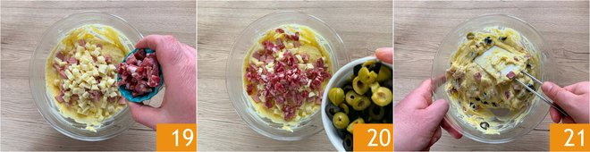 the cheese, the salami 19, and the olives 20. Now mix everything with a spatula 21.