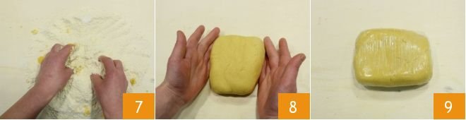 Briefly knead the shortcrust pastry 7 and shape it into a dough ball 8 that you can wrap in plastic wrap 9 and place in the refrigerator to firm up for at least 30 minutes.