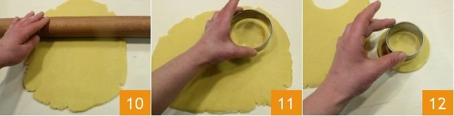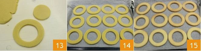 You will thus obtain the ring shape 13; once ready, you can place them on a baking sheet lined with parchment paper, keeping them relatively close together 14, and bake in a preheated static oven at 350°F for about 15 minutes (320°F for about 10 minutes in a fan oven). Once cooked, remove from the oven 15 and let them cool.