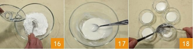 Meanwhile, prepare the Water Glaze: pour the powdered sugar into a small bowl and gradually add the hot water 16, mixing with a teaspoon to obtain a fluid mixture 17. Divide it into five small bowls 18, as many as the colors of the Olympic rings.