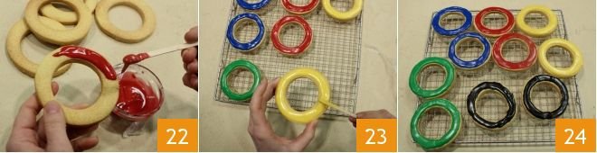Now, simply brush the surface of the rings, alternating the different colors 22 and using a flat wooden spatula, being careful not to overflow 23. Let the Olympic rings dry on a cooling rack 24 and then serve them for an original snack!
