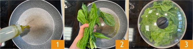 To make the easy pasqualina pie, start with the chard: heat a drizzle of oil in a wide nonstick pan 1, add the chard 2 and cover with a lid 3.