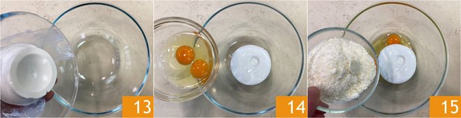 Move on to the white filling: in another bowl put the ricotta 13, the eggs 14 and the grated cheese 15.