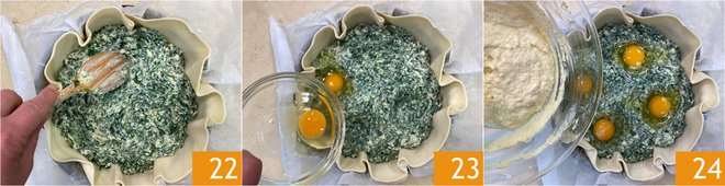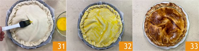 Brush the surface and edges of the pie with the mixture obtained 31. Bake in a preheated conventional oven at 392°F for about 50 minutes. Once golden, remove from the oven and let it cool slightly. Your easy pasqualina pie is ready to be served 33!