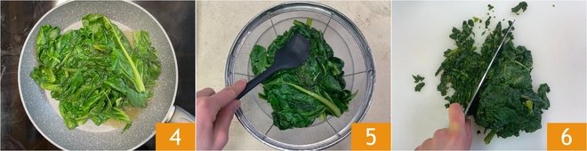 Cook over medium heat for about 10–15 minutes, just long enough for it to wilt 4. Pour the chard into a colander and press well to remove excess water 5; this way the pastry will stay crisp. Finally, chop it finely with a knife 6.