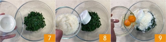 For the green filling: transfer the chopped chard to a bowl, then add the ricotta 7, the grated cheese 8 and the eggs 9.