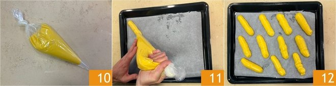 Transfer the dough into a piping bag without a nozzle 10 and cut the tip to a width of about 0.6 inches. Line a baking sheet with parchment paper and form strips about 4-5 inches long 11, spacing them apart 12. Bake in a preheated static oven at 338°F for about 45 minutes, being careful not to open the oven during baking.