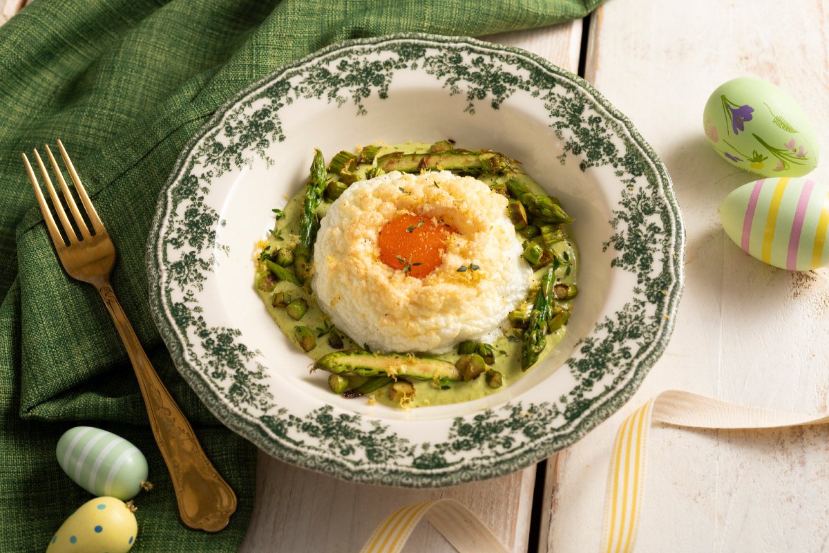 From the combination of the symbolic ingredient of Easter, the eggs, and the quintessential spring vegetable, asparagus, comes a creative and scenic appetizer, ideal for your festive menu: egg and asparagus clouds! A simple yet impressive dish that captivates with its delicacy and the balance between different textures: the softness of whipped egg whites, the creaminess of the runny yolk, and the crunchiness of Asparagus in the pan, all laid on a velvety vegetable cream scented with thyme. A refined reinterpretation of the classic "Asparagus Milanese" duo, which will amaze your guests with its originality!