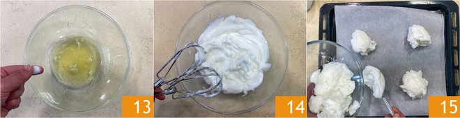 Move on to the eggs: separate the egg whites from the yolks, trying to keep the yolks intact. Place the egg whites in a bowl and use mixers, then add a pinch of salt 13 and continue to whip; you should obtain a foamy and elastic consistency 14. Divide the mixture into 4 mounds and place them on a baking sheet lined with parchment paper 15.