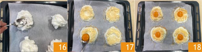 With the back of a spoon, create indentations in the center to hold the yolks 16 and try to shape them as well. Bake in a static oven at 392°F for 6 minutes. At this point, remove from the oven and gently slide the yolks into the indentations 17, then bake again and cook for another 2-3 minutes 18.