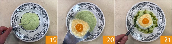 You are ready to plate: spread the asparagus cream at the base of the plate 19, then place the egg cloud on top 20 and arrange the sautéed asparagus all around 21.