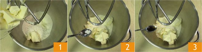 To prepare the eggless shortcrust pastry, pour the flour and cold butter from the fridge into the bowl of a stand mixer fitted with a paddle attachment 2, add the salt 2 and vanilla extract 3 and mix for 3 minutes.